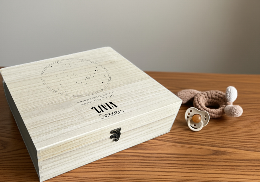 Een bijzondere geboortekist / memorybox als cadeau of voor je eigen kleintje. Elke sterrenkaart afdruk is een uniek aandenken geeft de sterrenhemel weer op een specifiek moment op een specifieke plaats